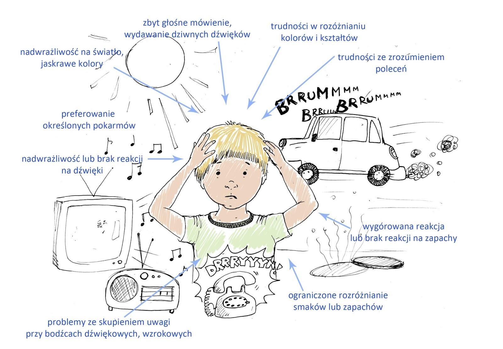 Pytanie w tytule jest nieco przewrotne. Właściwie należałoby je sformułować inaczej. Dlaczego niektóre dzieci nie włożą swetra czy konkretnej bluzki skarżąc się, że materiał je gryzie. I nie mam tu na myśli wełnianego swetra, który nawet mnie odstrasza, tylko całkiem zwyczajne bluzeczki, spodenki czy koszulki. A metka z ubrania? Ta to dopiero jest krwiożercza! Obcinanie paznokci, mycie głowy czy szczotkowanie zębów to każdorazowo horror. Dlaczego niektóre dzieci z drobnego skaleczenia robią rodzinną tragedię, a inne z kolei na poważny upadek nie reagują wcale? Dlaczego zdarzają się dzieci, które w przesadny sposób reagują na dźwięki czy zapachy, podczas gdy bywają i takie, które ignorują bodźce tego typu. Są dzieci, które trudno zatrzymać, wciąż biegają, skaczą, obracają się. Najchętniej spędziłyby pół dnia na huśtawce, a drugie pół na karuzeli. Są również i takie dzieci, które place zabaw omijają szerokim łukiem, gdyż każdy szybszy ruch wywołuje u nich lęk. To tylko niektóre z przykładów problemów z integracją sensoryczną. Ich spektrum jest bardzo szerokie i zróżnicowane. Problemy mogą dotyczyć każdego ze zmysłów, świadczyć bądź o nadwrażliwości danego zmysłu, bądź o zbyt słabej wrażliwości systemu przy jego niedowrażliwości.